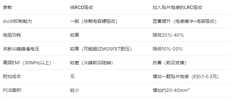 ¾ßÌå¶øÑÔ£¬ÔÚRCDÎüÊÕµç·ÖУ¬½«ÌùƬµç¸ÐÓëÎüÊÕµçÈÝ´®Áª£¬ÐγÉÒ»¸öLRCгÕñÎüÊÕÍøÂç¡£µ±¹Ø¶Ï¼â·åµ½À´Ê±£¬µç¸ÐÏÞÖÆ³äµçµçÁ÷µÄÉÏÉýÂÊ£¬Ê¹µçÈÝÁ½¶ËµÄµçѹƽ»º½¨Á¢£¬½ø¶øÊ¹Â©¼«µçѹ²¨ÐεÄÇ°ÑØÐ±ÂÊ£¨dv/dt£©µÃµ½ÓÐЧÒÖÖÆ¡£Ïà½ÏÓÚ´¿RCD·½°¸£¬¼ÓÈëµç¸Ðºó£¬ÎüÊÕ»ØÂ·´Ó¡°µç×èºÄÄÜ¡±²¿·ÖתÏò¡°µç¸Ð»º³å¡±£¬ÔÚ²»ÏÔÖøÔö¼Ó¹¦ºÄµÄǰÌáϸÄÉÆÁ˲¨Ðζ¸ÇͶÈ¡£
